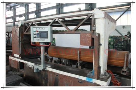 這是一臺專門針對大口徑管切斷研發(fā)的全自動切管機,用旋轉(zhuǎn)刀方式切管,切管時工件不轉(zhuǎn)動,刀具旋轉(zhuǎn)進行削切,隨著刀具每旋轉(zhuǎn)一圈逐步進刀,從管外徑層層削切至管外徑達到切斷圓管的作用。和車床切管方式相反。設(shè)備用雙伺電機控制進刀,進刀穩(wěn)定,特別適用于大口徑管如氧氣瓶等壓力容器管的切斷。